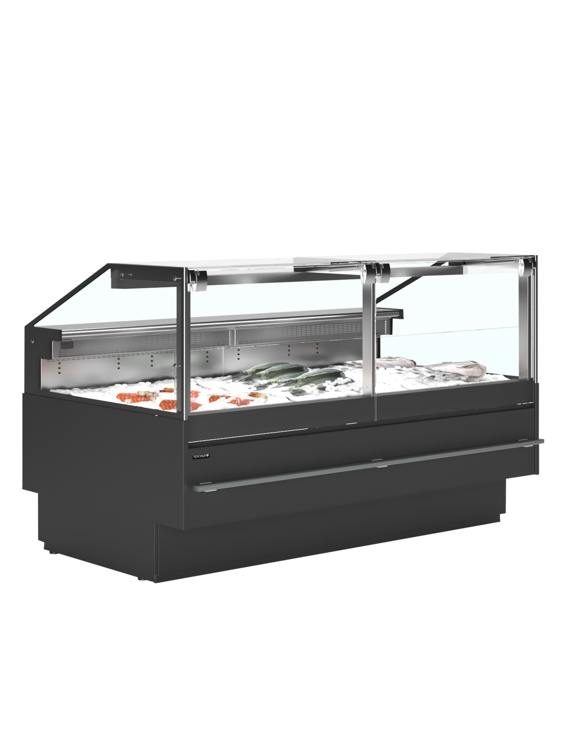 La façade vitrée anti‑buée assure une visibilité parfaite tout au long de la journée, même dans les environnements les plus humides. Pour simplifier l’entretien quotidien, la vitre avant se relève entièrement, permettant un accès rapide et un nettoyage efficace. L’éclairage LED supérieur met en lumière les couleurs naturelles du poisson et des fruits de mer, renforçant l’attractivité du comptoir et stimulant l’achat.